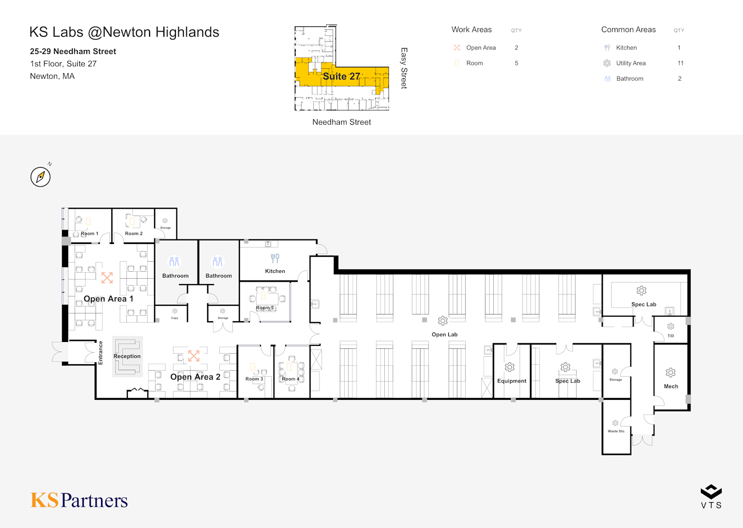 KS Labs @Newton Highlands, located at 25-29 Needham Street, offers completely move-in-ready lab/office flex space in the lively Boston suburb of Newton, Massachusetts. Constructed in 1965 with completed renovations in 2023, the two-story building contains flex space ideally suited for all laboratory, biomanufacturing, office, and R&D use. Property features include 3-inch concrete slab floors, loading dock access, city water and sewer, sprinklers, and backup generators in case of emergencies.